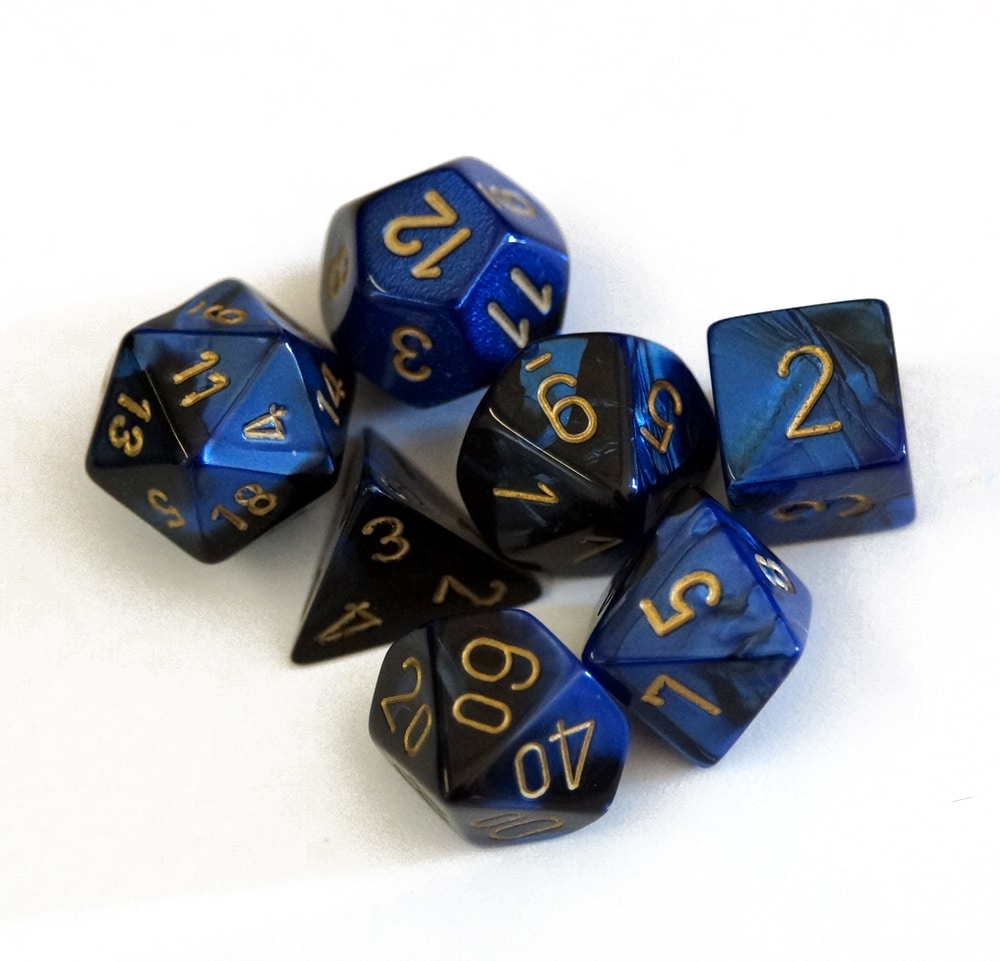 Es werden sieben Würfel mit unterschiedlicher Seitenzahl in einer kleinen Plastikbox geliefert.