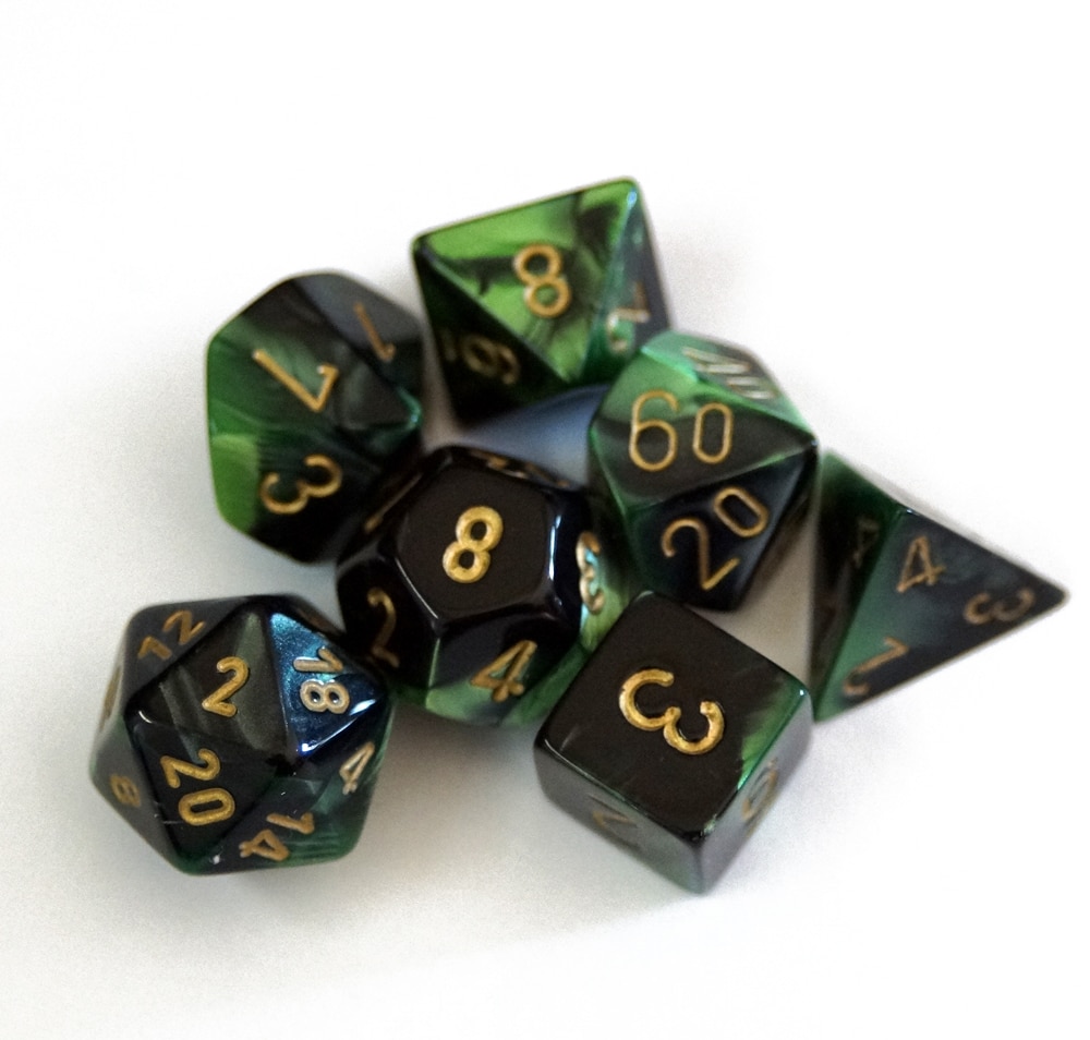 Es werden sieben Würfel mit unterschiedlicher Seitenzahl in einer kleinen Plastikbox geliefert.