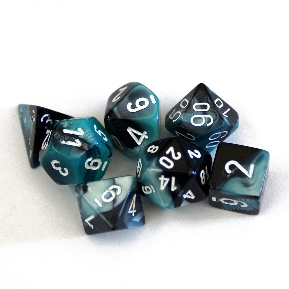 Es werden sieben Würfel mit unterschiedlicher Seitenzahl in einer kleinen Plastikbox geliefert.