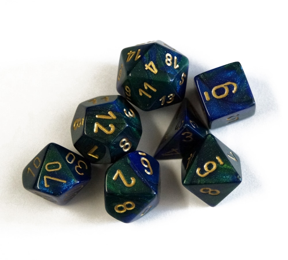 Es werden sieben Würfel mit unterschiedlicher Seitenzahl in einer kleinen Plastikbox geliefert.