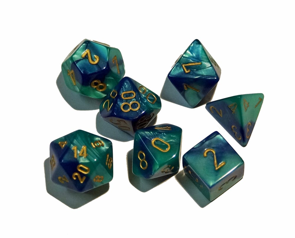 Es werden sieben Würfel mit unterschiedlicher Seitenzahl in einer kleinen Plastikbox geliefert.