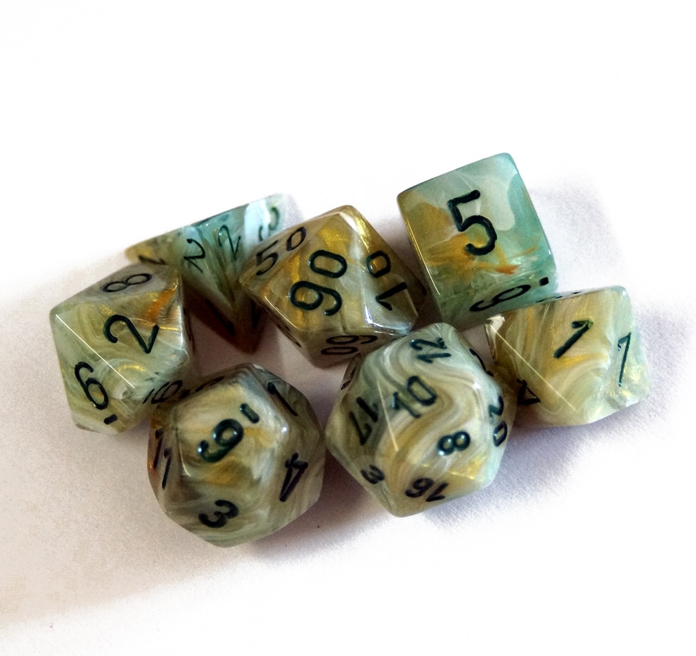 Es werden sieben Würfel mit unterschiedlicher Seitenzahl in einer kleinen Plastikbox geliefert.