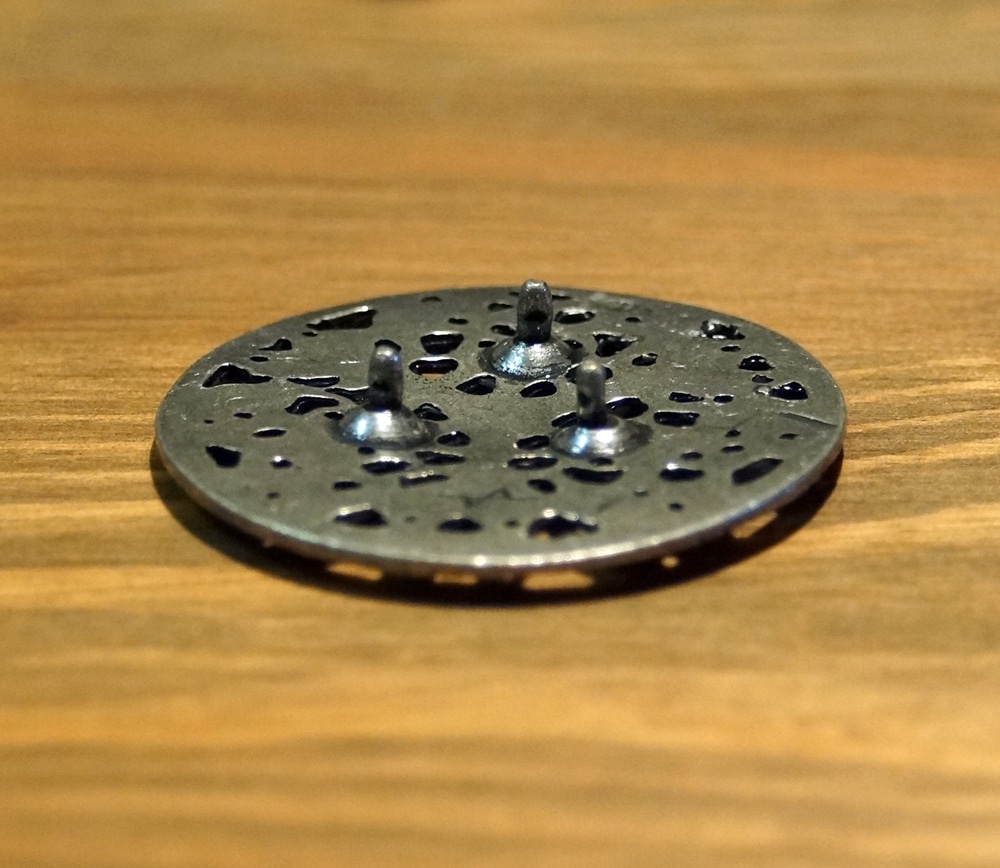 Auf der Rückseite befinden sich drei 3mm lange Stifte, auf die zur Befestigung einfach die kleinen, mitgelieferten Kappen aufgesetzt und mit ein paar leichten Hammerschlägen fxiert werden.